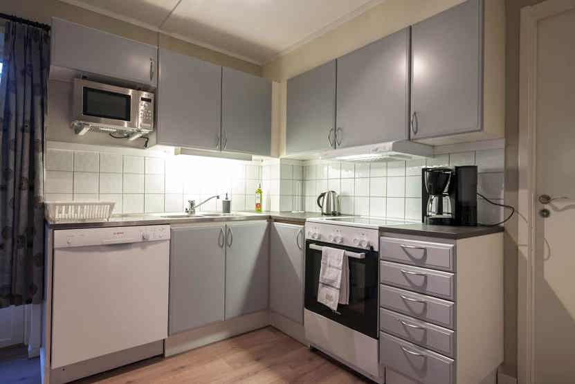 Køkkenet indeholder: elkomfur med ovn, køleskab, frys, microovn, opvaskemaskine.