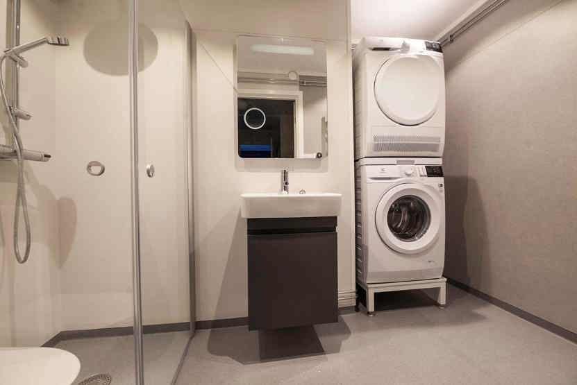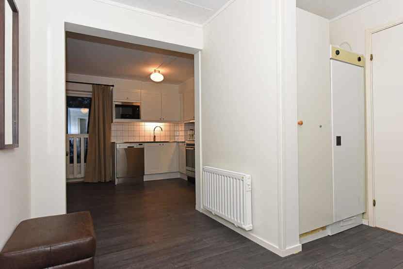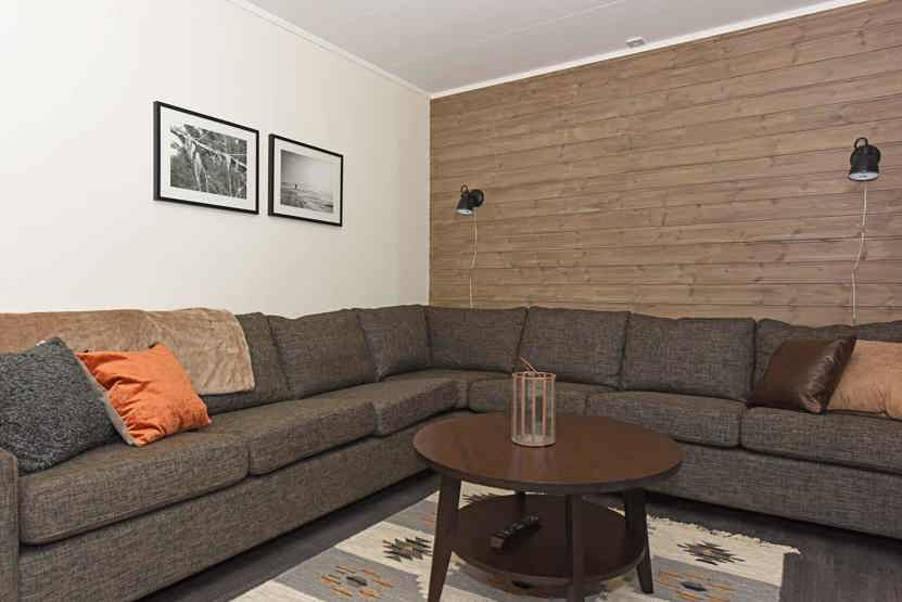Opholdsstue med køkkenafdeling. TV, vaskemaskine, tørretumbler, tørreskab, rum til skiudstyr.