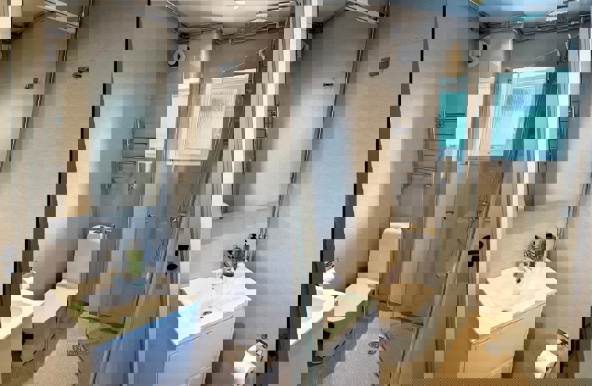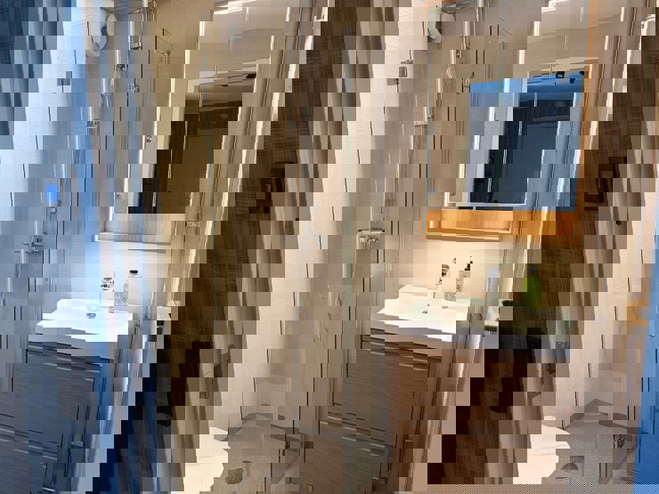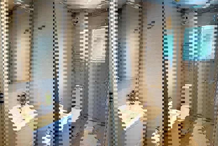 Badeværelset-1 = 1 bruse/wc. Badeværelset-2 = 1 bruse/wc/sauna.