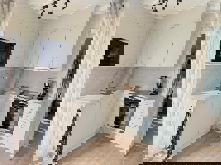 Køkkenet indeholder: elkomfur med ovn, køleskab, frys, microovn, opvaskemaskine.