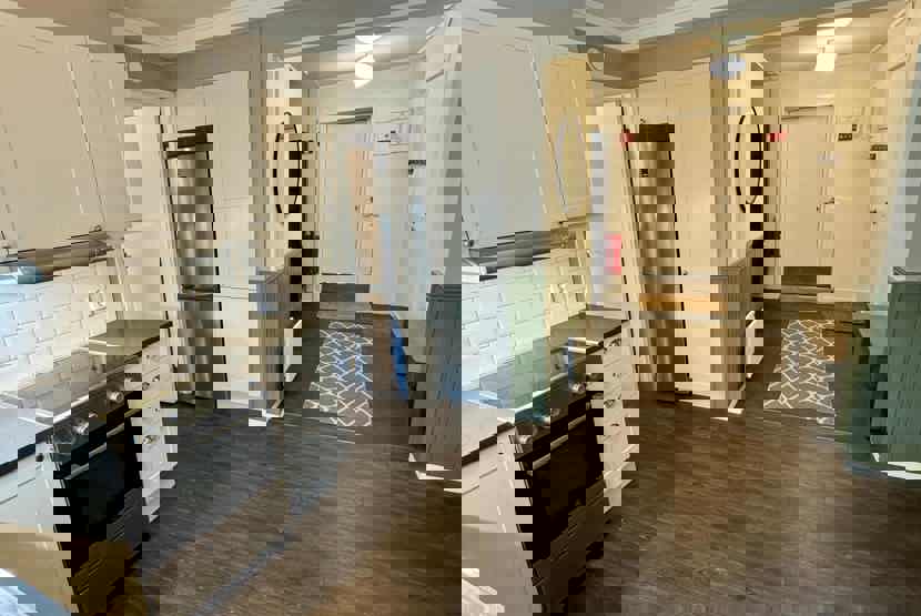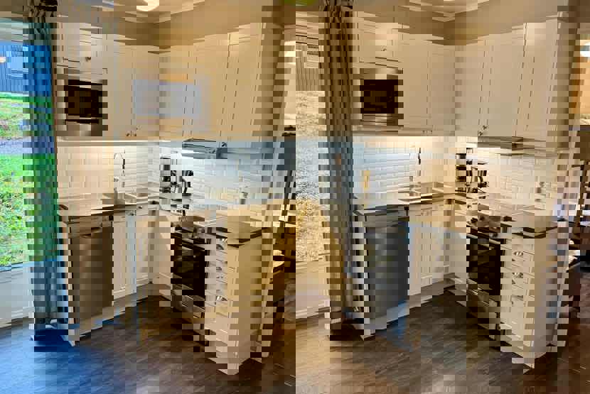 Køkkenet indeholder: elkomfur med ovn, køleskab, frys, microovn, opvaskemaskine.