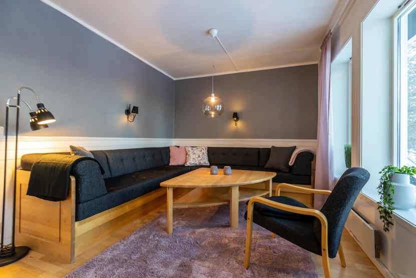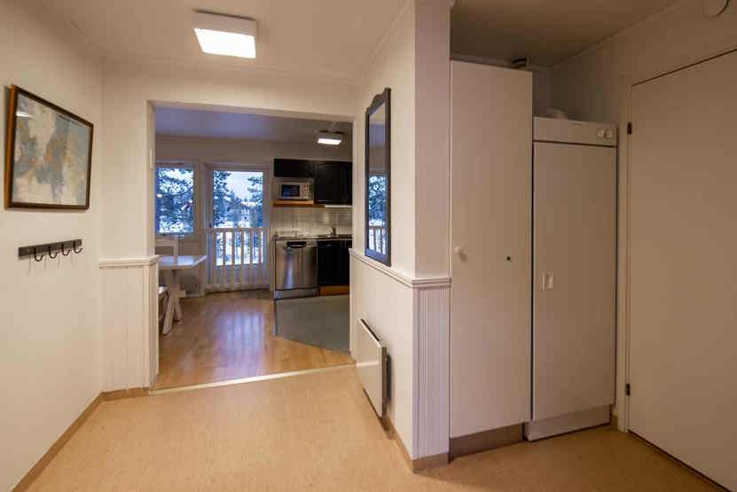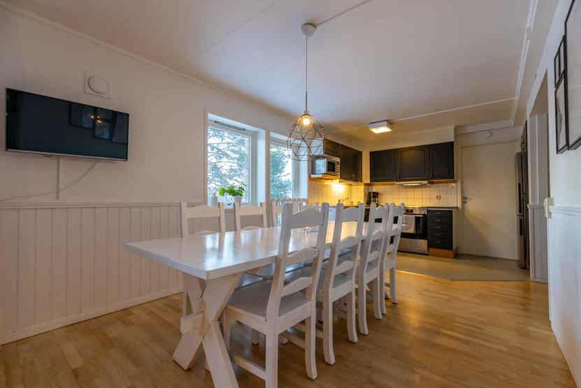 Opholdsstue med køkkenafdeling. TV, tørreskab, rum til skiudstyr.