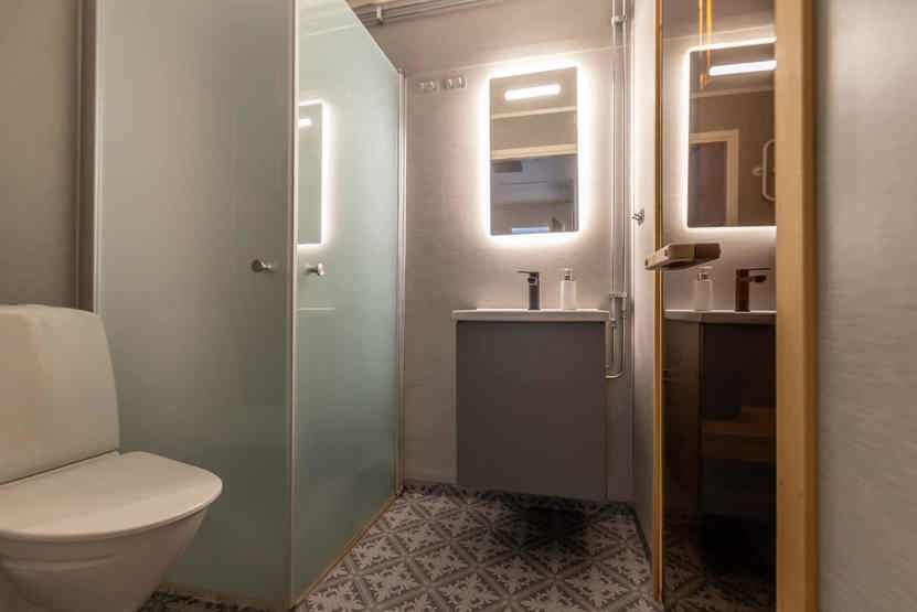 Badeværelset-1 = 1 bruse/wc/sauna. Badeværelset-2 = 1 bruse/wc.