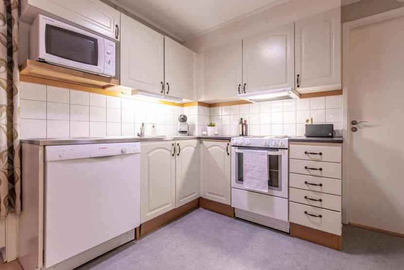 Køkkenet indeholder: elkomfur med ovn, køleskab, frys, opvaskemaskine, microovn.