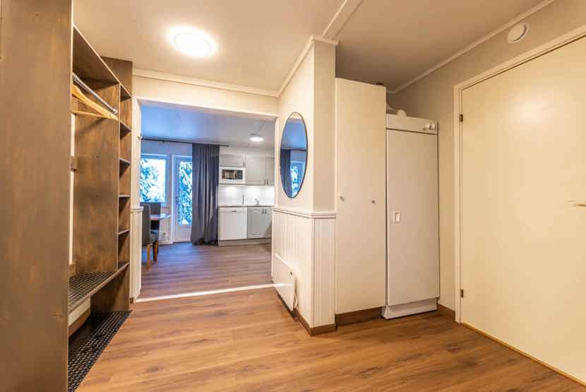Opholdsstue med køkkenafdeling. TV, tørreskab, rum til skiudstyr, altan (skovles ikke).