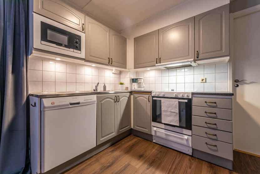 Køkkenet indeholder: elkomfur med ovn, køleskab, frys, microovn, opvaskemaskine.