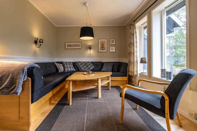Opholdsstue med køkkenafdeling. TV, tørreskab, rum til skiudstyr.