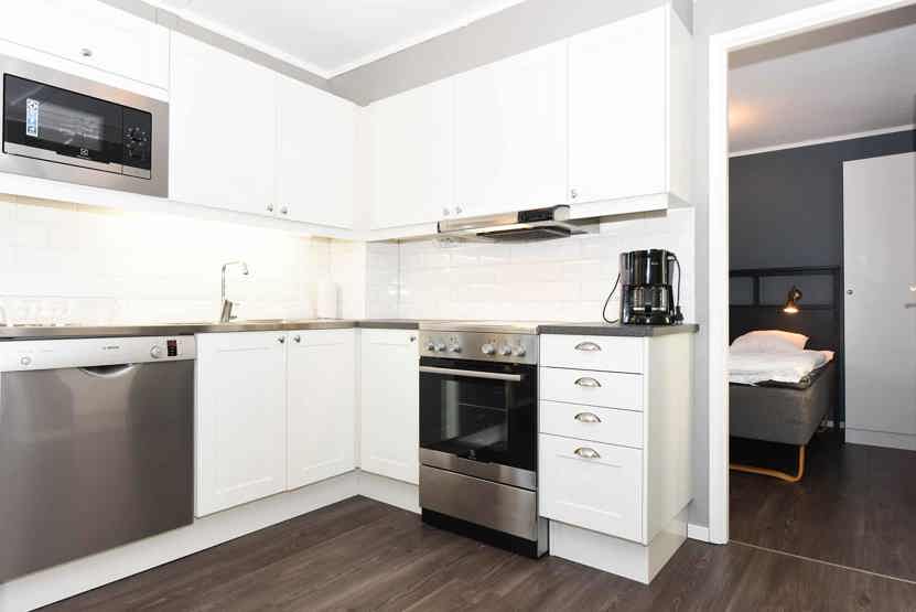 Køkkenet indeholder: elkomfur med ovn, køleskab, frys, microovn, opvaskemaskine.