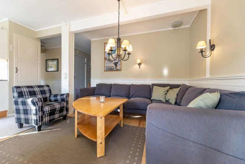 Opholdsstue med køkkenafdeling. TV, tørreskab, 1 højstol, 1 barneseng, rum til skiudstyr.