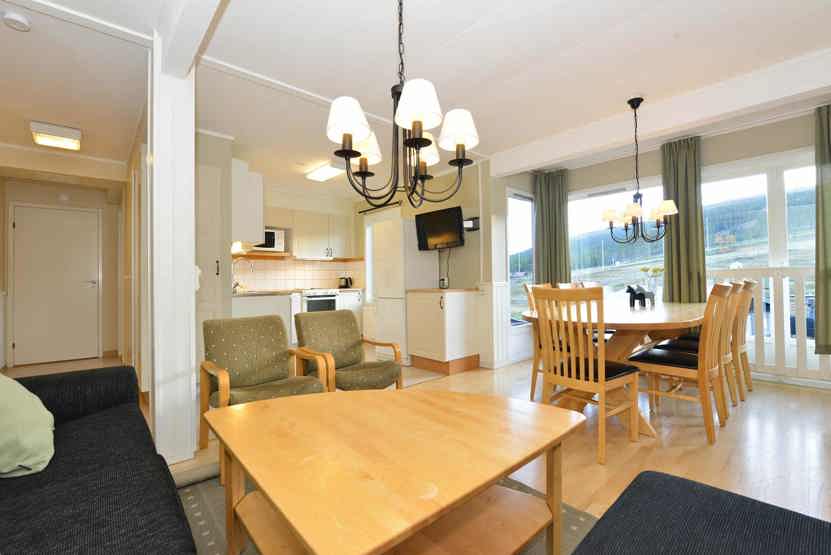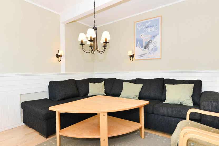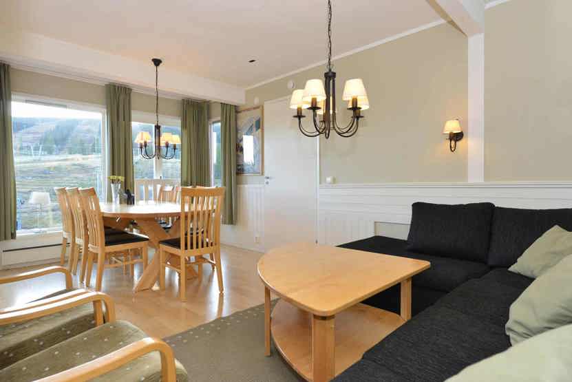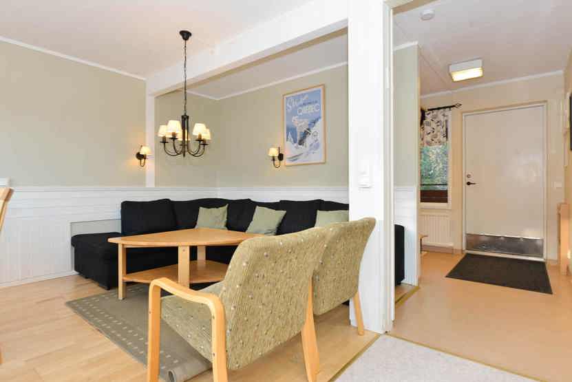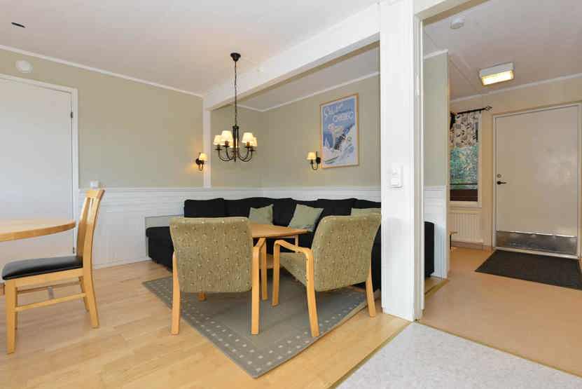 Opholdsstue med køkkenafdeling. TV, tørreskab, 1 højstol, 1 barneseng, rum til skiudstyr, havem¢bler.