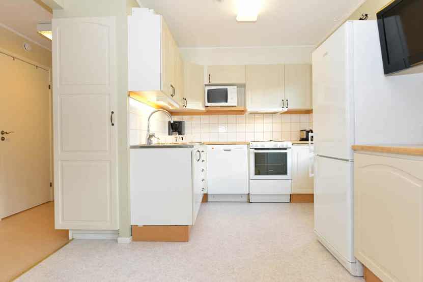 Køkkenet indeholder: elkomfur med ovn, køleskab, frys, microovn, opvaskemaskine.