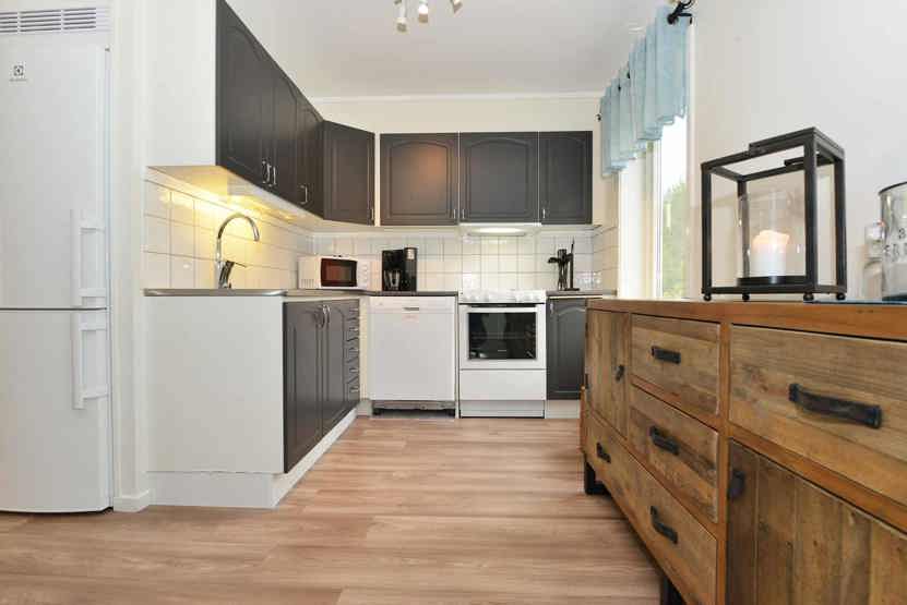 Køkkenet indeholder: elkomfur med ovn, køleskab, frys, microovn, opvaskemaskine.