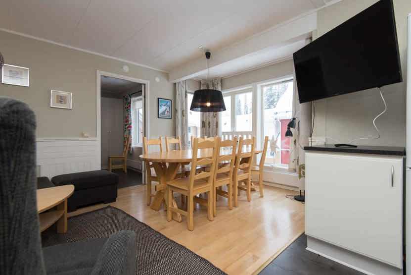 Opholdsstue med køkkenafdeling. TV, tørreskab, rum til skiudstyr.