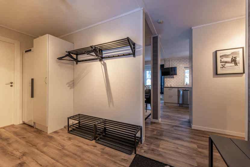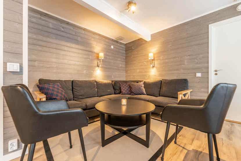 Opholdsstue med køkkenafdeling. TV, tørreskab, rum til skiudstyr.