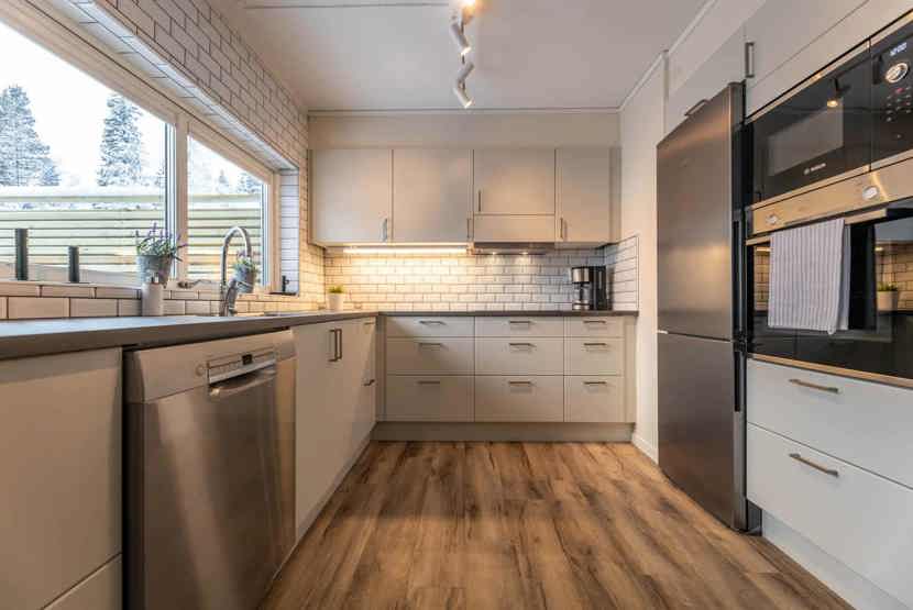 Køkkenet indeholder: elkomfur med ovn, køleskab, frys, microovn, opvaskemaskine.