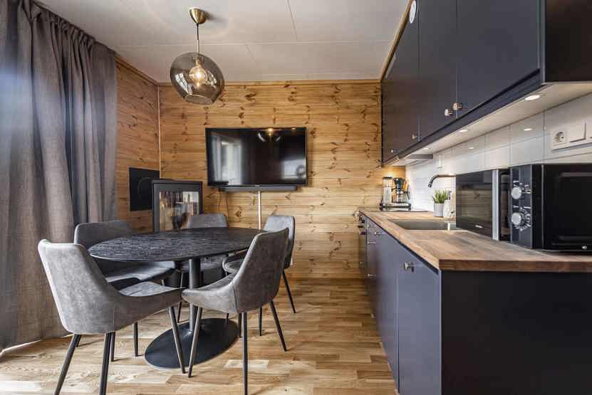 Køkkenet indeholder: Kogeplade med induktion, kombiugn med varmluft og microovn, køleskab, frys, opvaskemaskine, microovn.