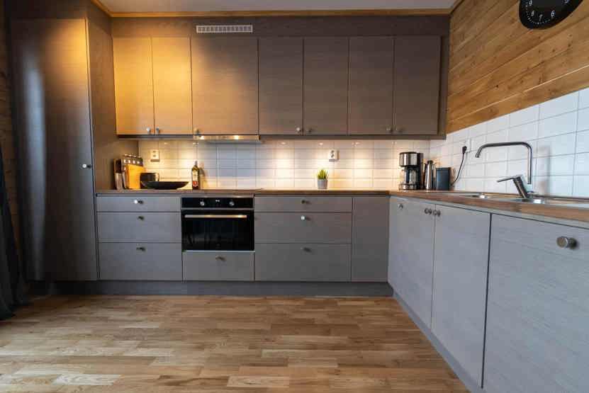 Køkkenet indeholder: Kogeplade med induktion, kombiugn med varmluft og microovn, køleskab, frys, opvaskemaskine.