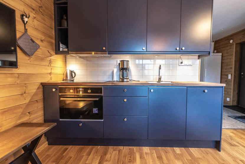 Køkkenet indeholder: Kogeplade med induktion, kombiugn med varmluft og microovn, køleskab, frys, opvaskemaskine.