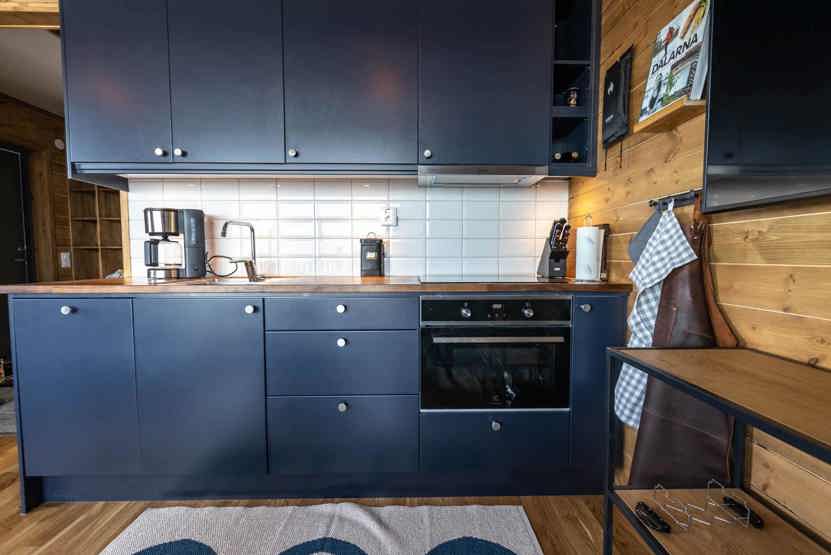 Køkkenet indeholder: Kogeplade med induktion, kombiugn med varmluft og microovn, køleskab, frys, opvaskemaskine.