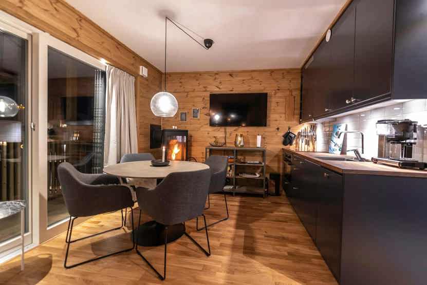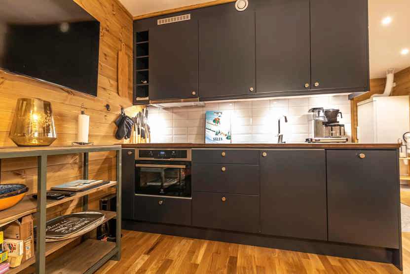 Køkkenet indeholder: Kogeplade med induktion, kombiugn med varmluft og microovn, køleskab, frys, opvaskemaskine, microovn.