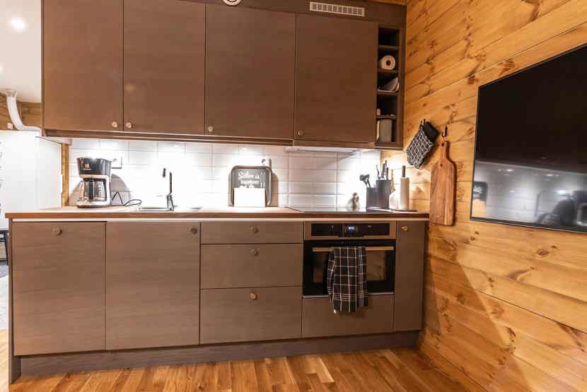 Køkkenet indeholder: Kogeplade med induktion, kombiugn med varmluft og microovn, køleskab, frys, opvaskemaskine.
