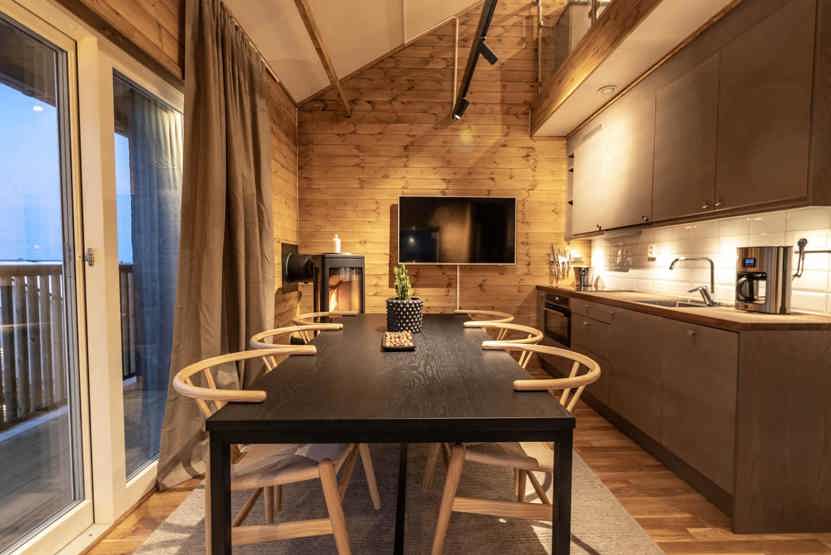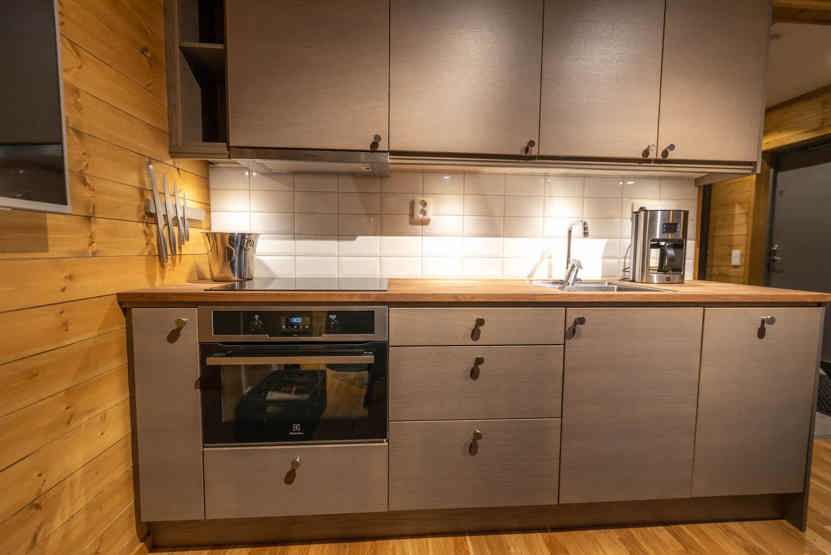 Køkkenet indeholder: Kogeplade med induktion, kombiugn med varmluft og microovn, køleskab, frys, opvaskemaskine, microovn.