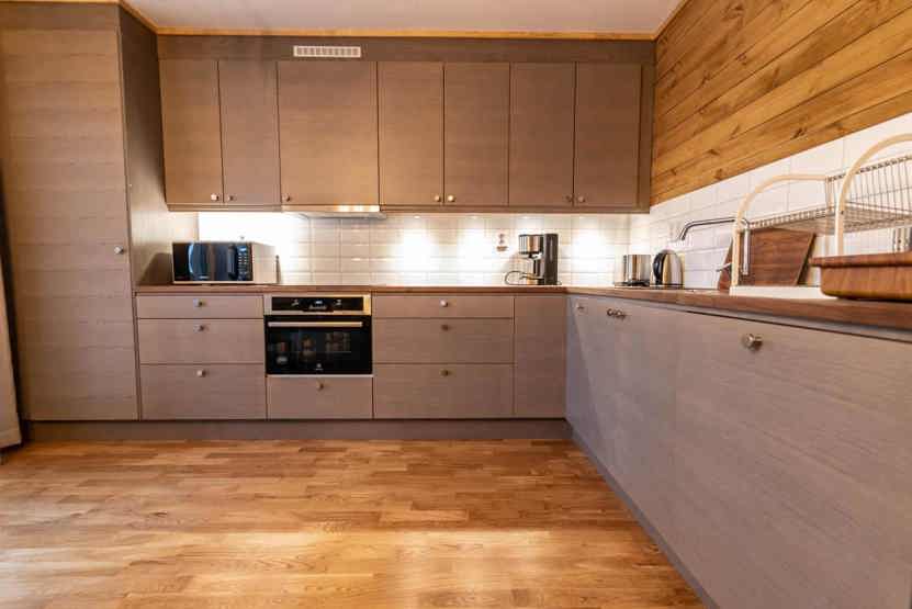 Køkkenet indeholder: Kogeplade med induktion, kombiugn med varmluft og microovn, køleskab, frys, opvaskemaskine.