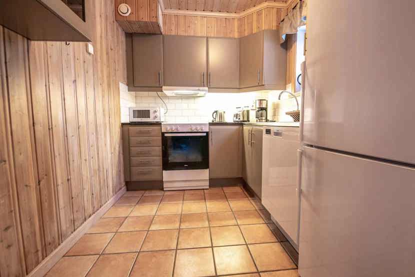 Køkkenet indeholder: elkomfur med ovn, microovn, opvaskemaskine, køleskab, frys.