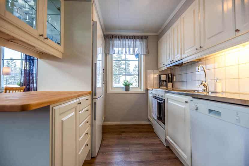 Køkkenet indeholder: elkomfur med ovn, køleskab, frys, microovn, opvaskemaskine.