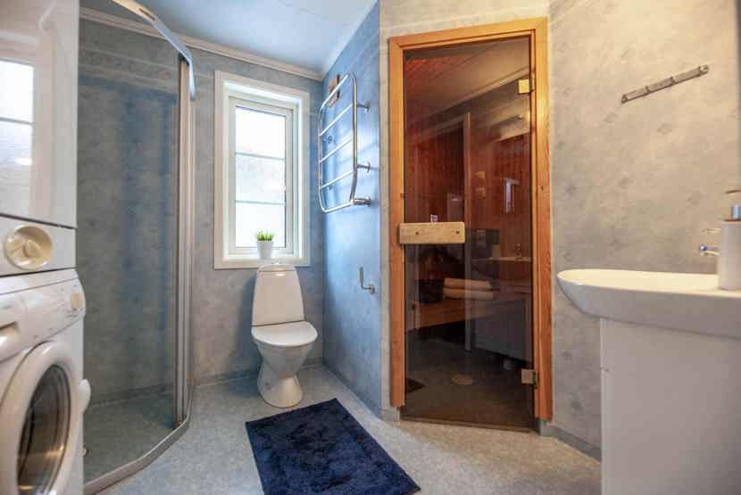 Badeværelset-1 = bruse/wc/sauna. Badeværelset-2 = bruse/wc/håndklædetørrer.