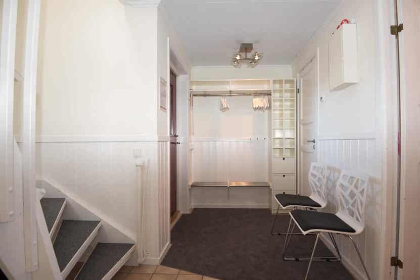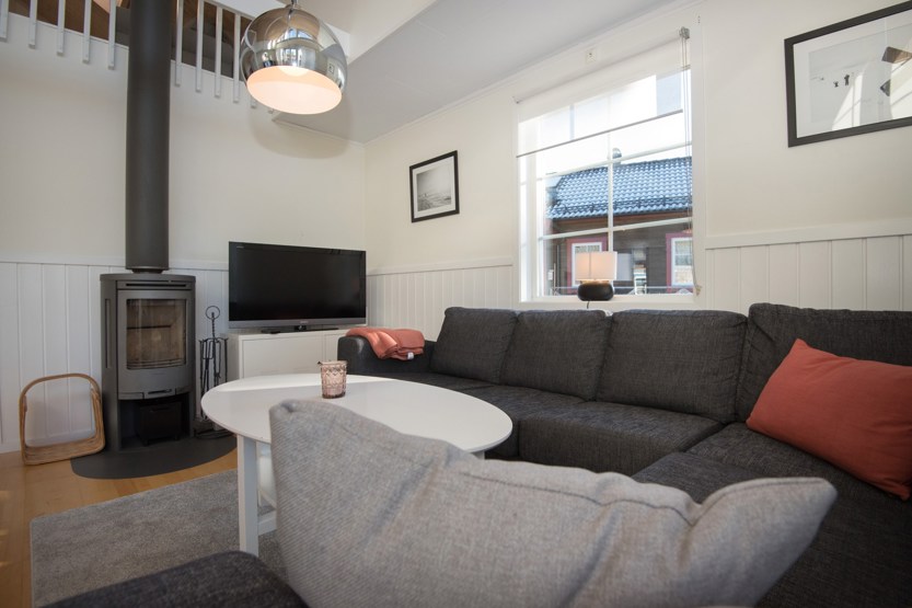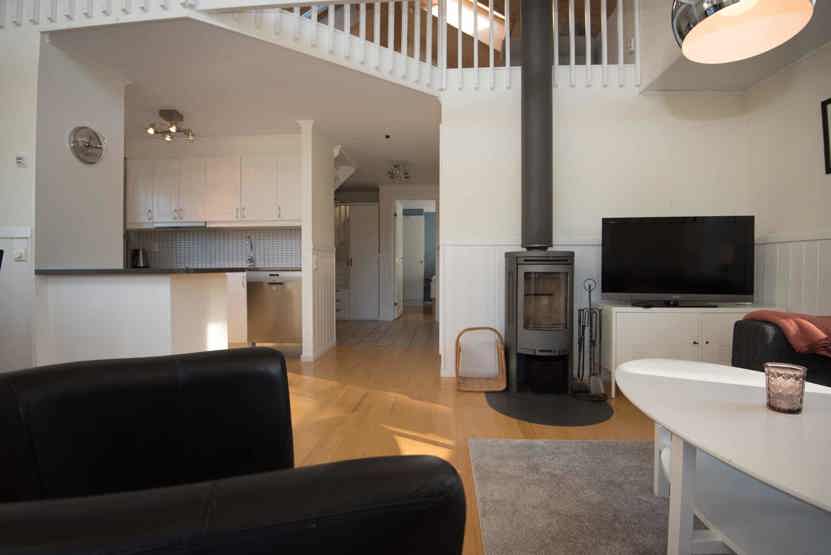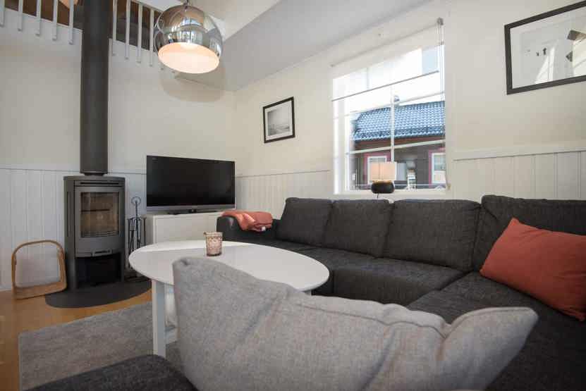TV, brændeovn (brænde indgår ikke), tørreskab, kombineret vaskemaskine/tørretumbler, 1 højstol, 1 barneseng, altan (skovles ikke).