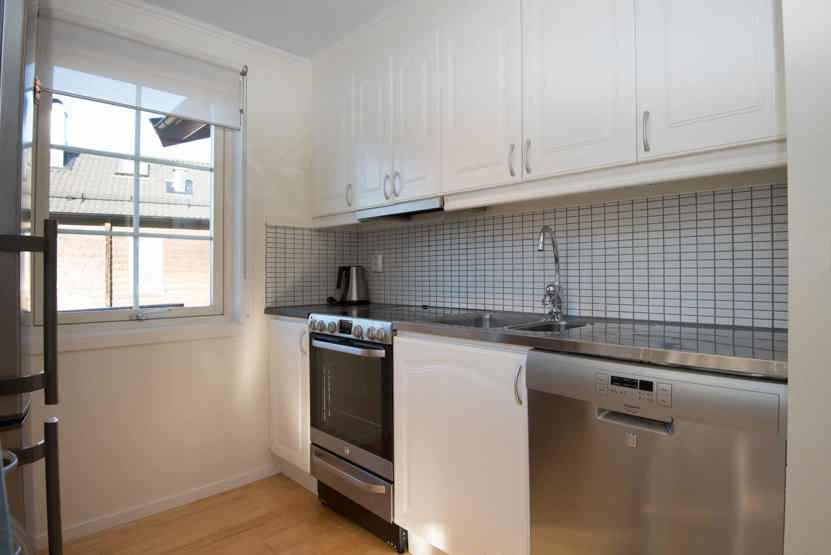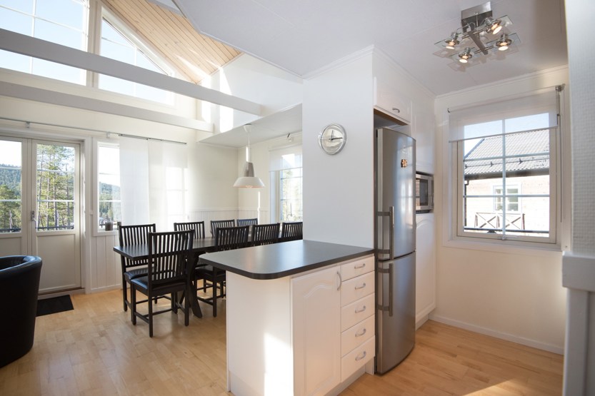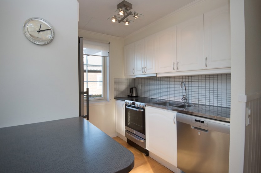Køkkenet indeholder: elkomfur med ovn, køleskab, frys, microovn, opvaskemaskine.