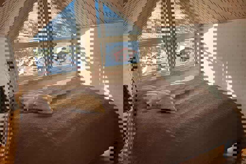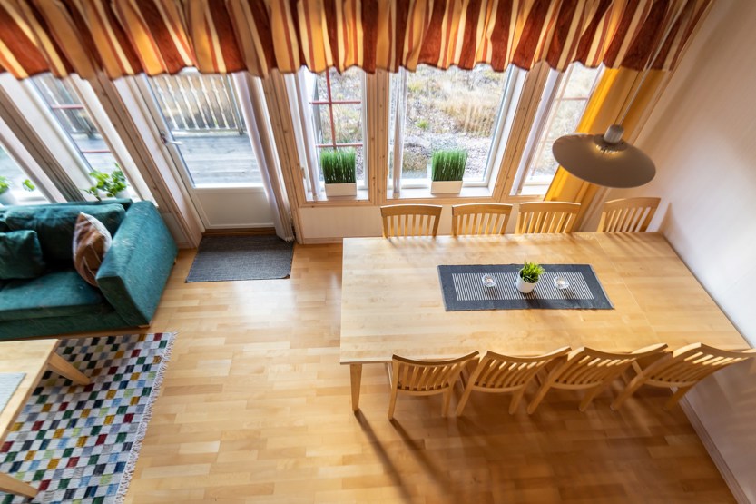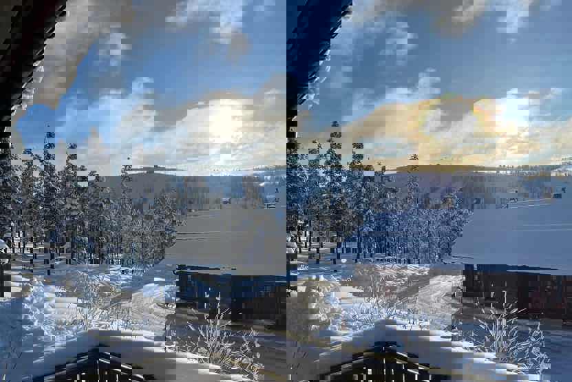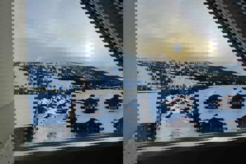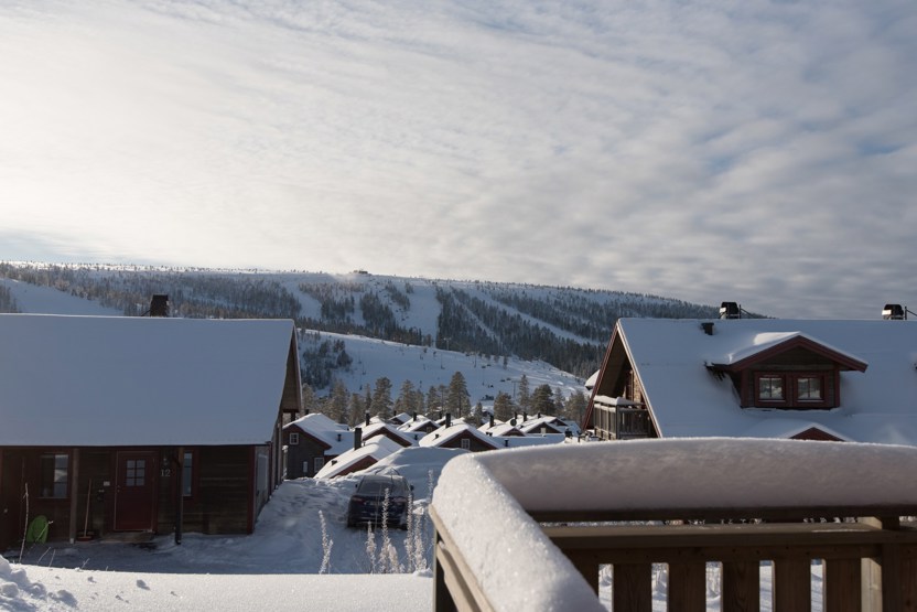 Horizon Lodge ligger ved Hundfjället. tvillinghus, 8 sengepladser, 82 m², alrum med køkkenafdeling, 3 soveværelser, 2 brusere, 2 WC, sauna.