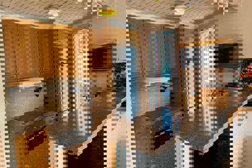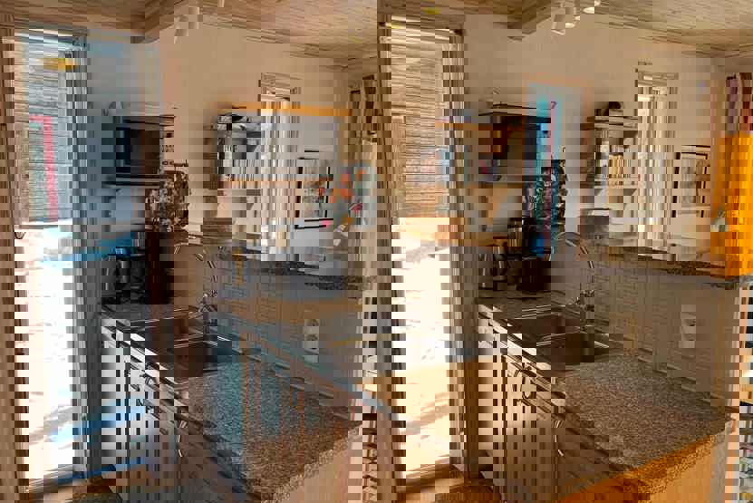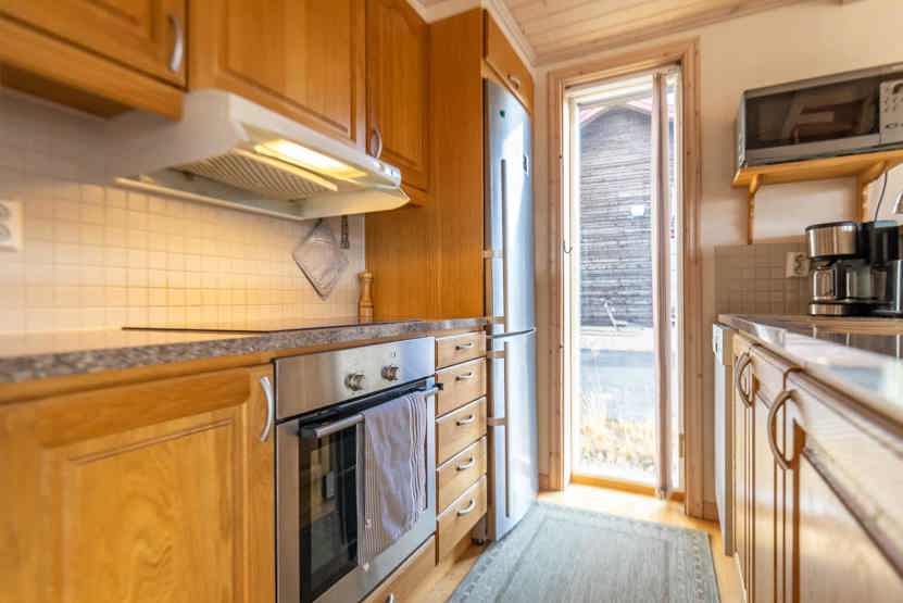 Køkkenet indeholder: Kogeplade med induktion, ovn, køleskab, frys, opvaskemaskine, microovn.