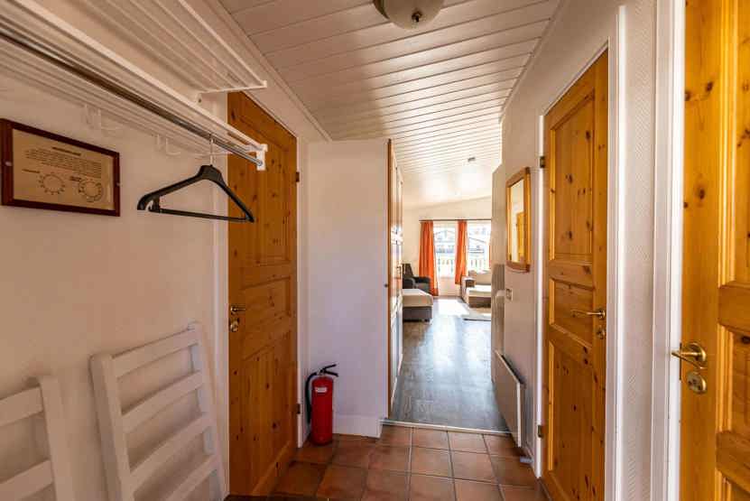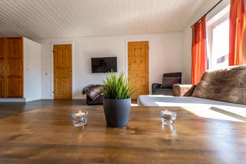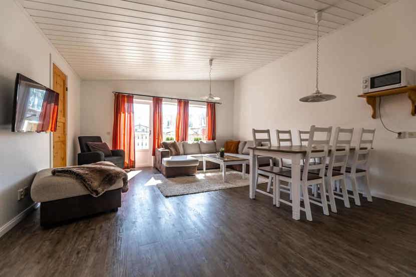 Opholdsstue med køkkenafdeling. TV, tørreskab, rum til skiudstyr, balkon.