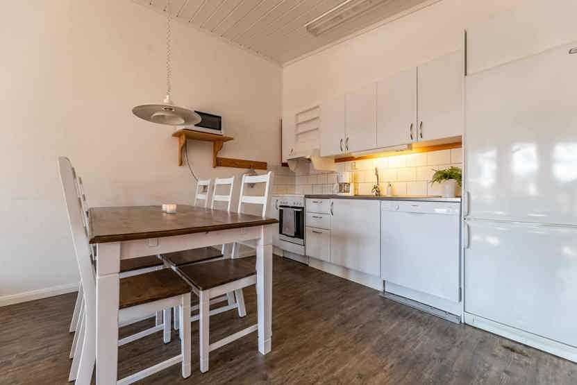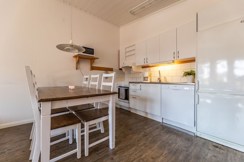 Køkkenet indeholder: elkomfur med ovn, køleskab, frys, opvaskemaskine, microovn.