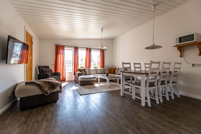 Opholdsstue med køkkenafdeling. TV, tørreskab, rum til skiudstyr, balkon.