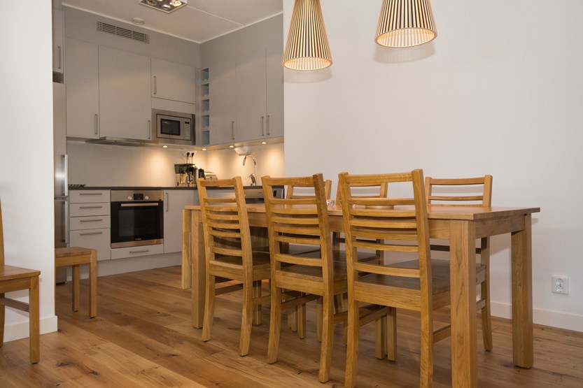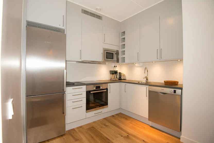 Køkkenet indeholder: elkomfur med ovn, køleskab, frys, opvaskemaskine, microovn.