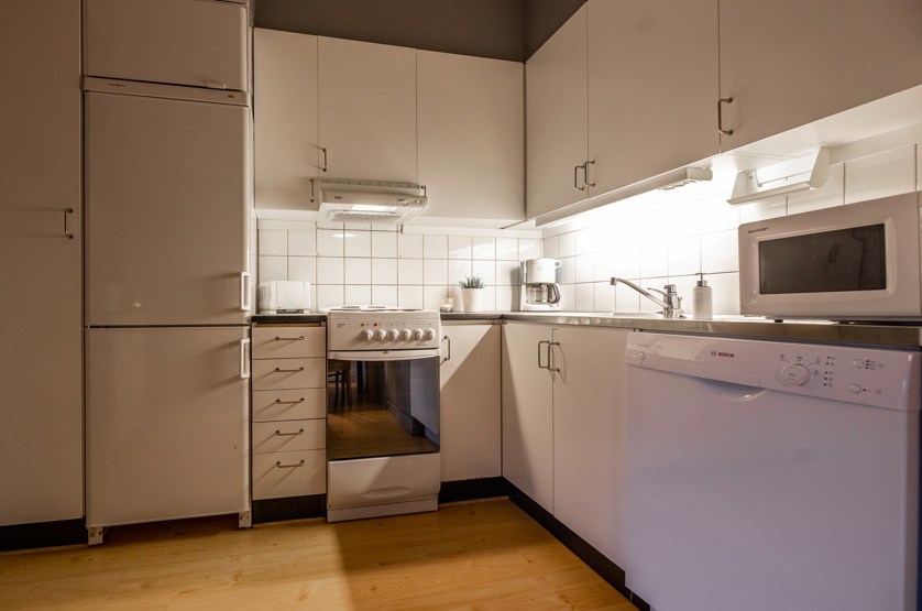 Køkkenet indeholder: elkomfur med ovn, køleskab, frys, opvaskemaskine, microovn.