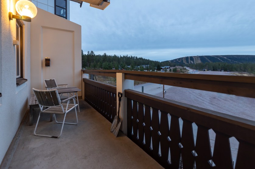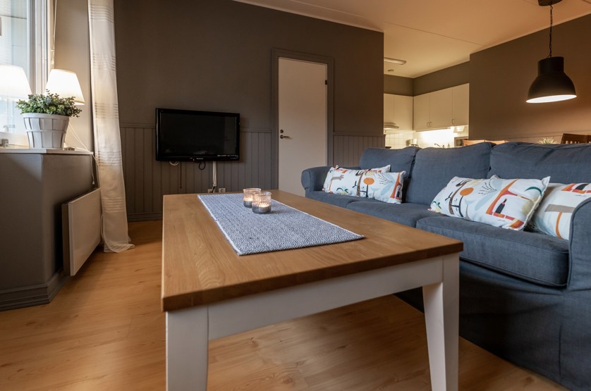 Opholdsstue med køkkenafdeling. TV, tørreskab, rum til skiudstyr, balkon, Adgang til sauna og vaskerum, elevator findes i huset.