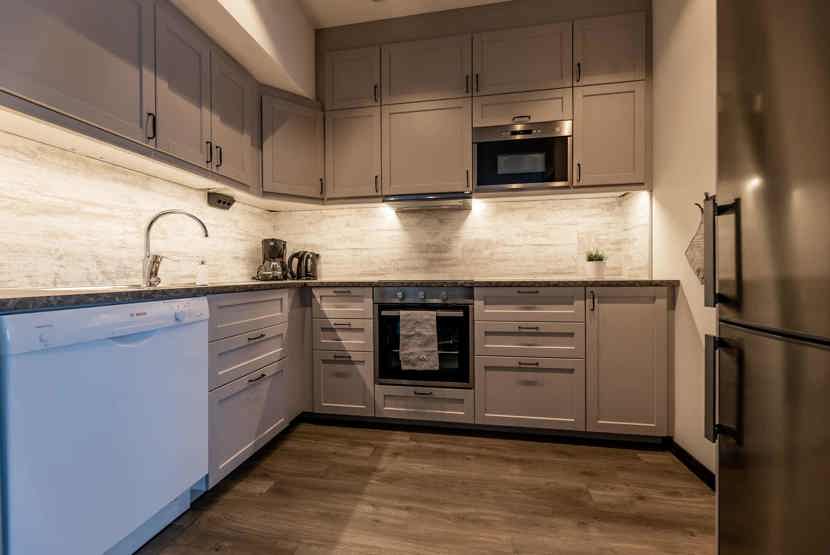 Køkkenet indeholder: elkomfur med ovn, køleskab, frys, microovn, opvaskemaskine.
