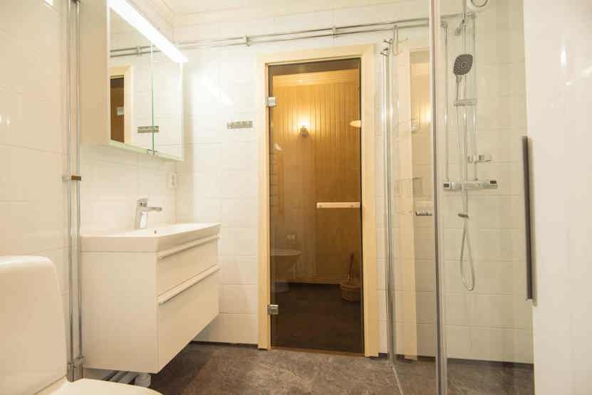 Badeværelset-1 = bruse/wc/sauna. Badeværelset-2 = bruse/wc.