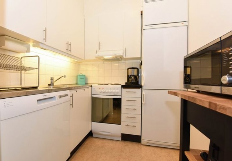 Køkkenet indeholder: elkomfur med ovn, køleskab, frys, opvaskemaskine, microovn.