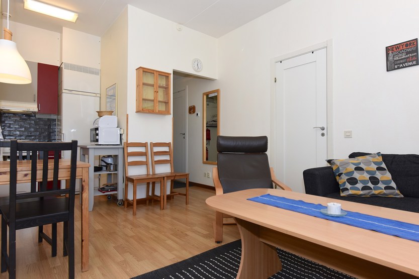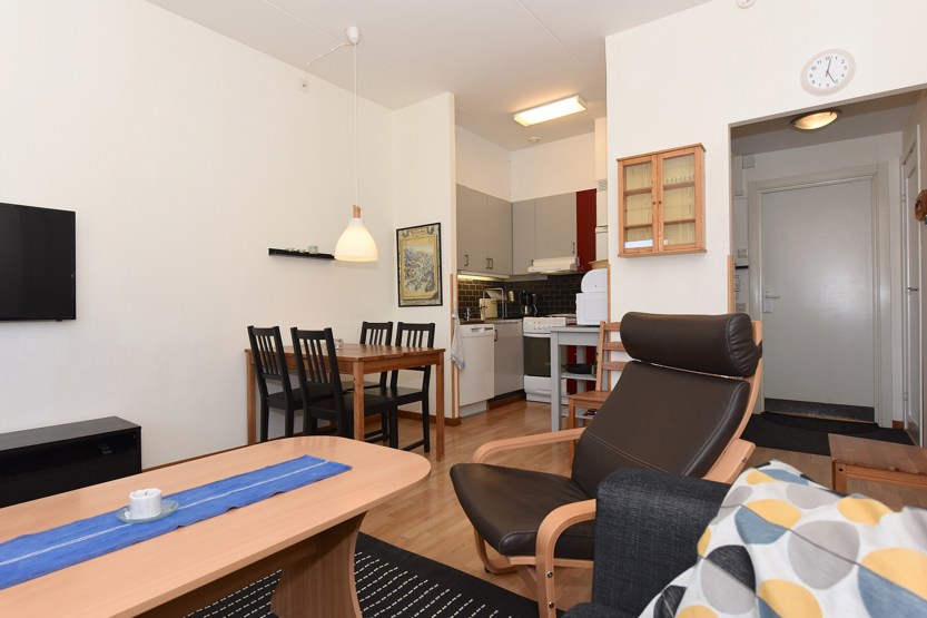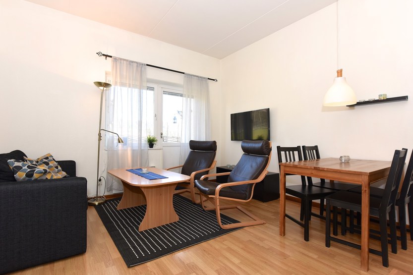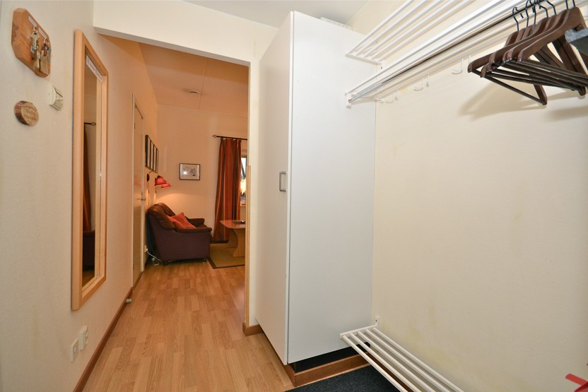Opholdsstue med køkkenafdeling. TV, tørreskab, rum til skiudstyr, udeplads (skovles ikke), Adgang til sauna og vaskerum, elevator findes i huset.