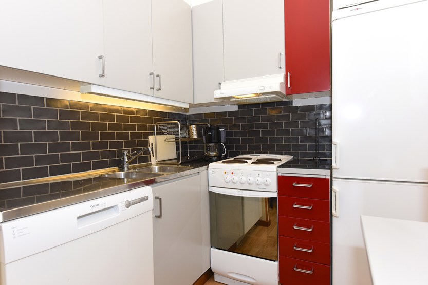 Køkkenet indeholder: elkomfur med ovn, køleskab, frys, opvaskemaskine, microovn.