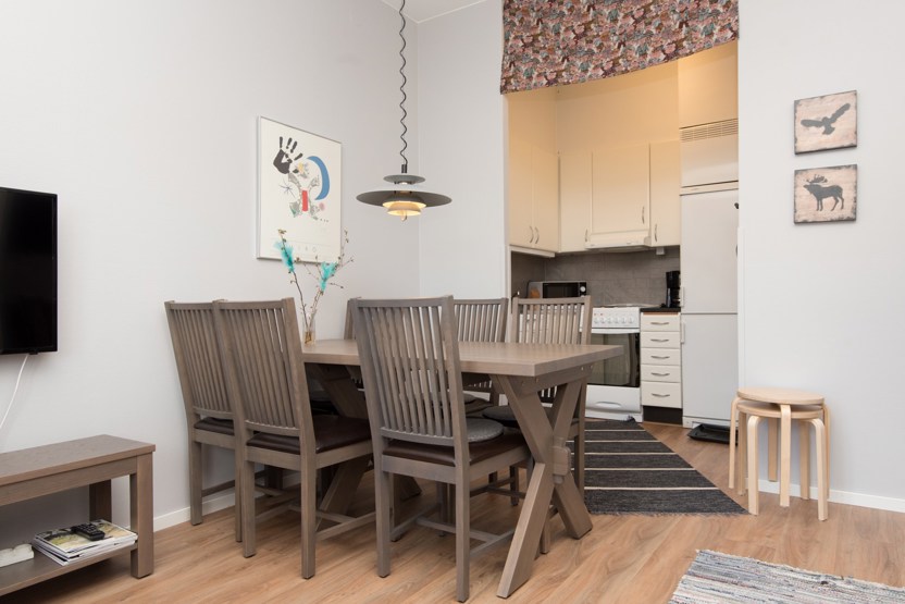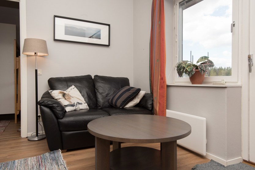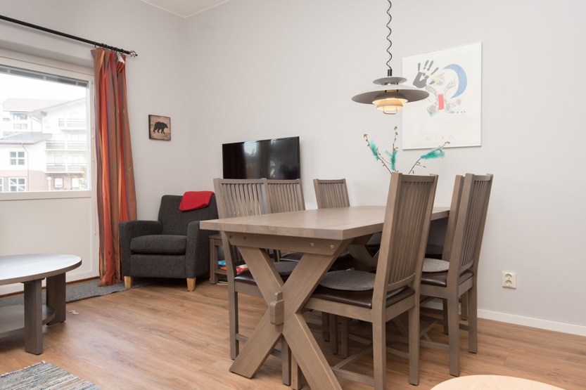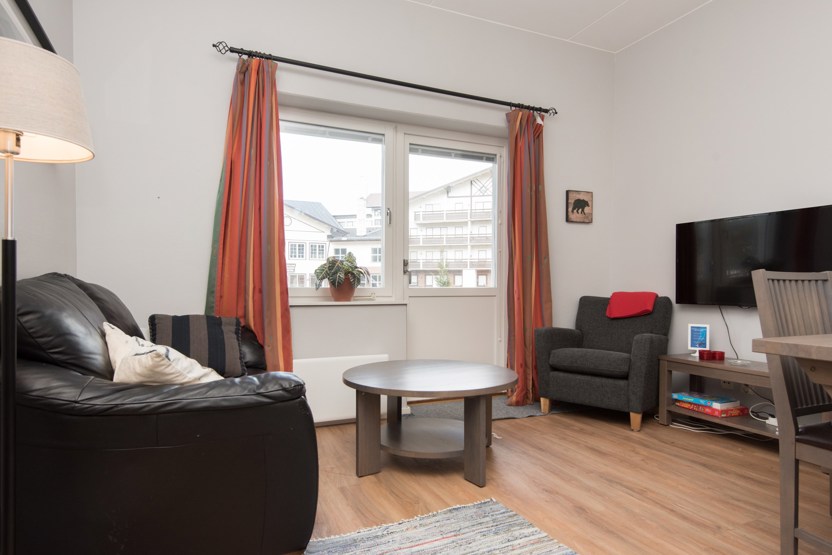 Opholdsstue med køkkenafdeling. TV, tørreskab, rum til skiudstyr, udeplads (skovles ikke), Adgang til sauna og vaskerum, elevator findes i huset.