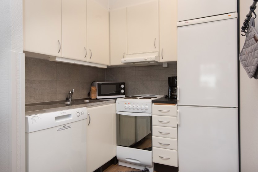 Køkkenet indeholder: elkomfur med ovn, køleskab, frys, opvaskemaskine, microovn.