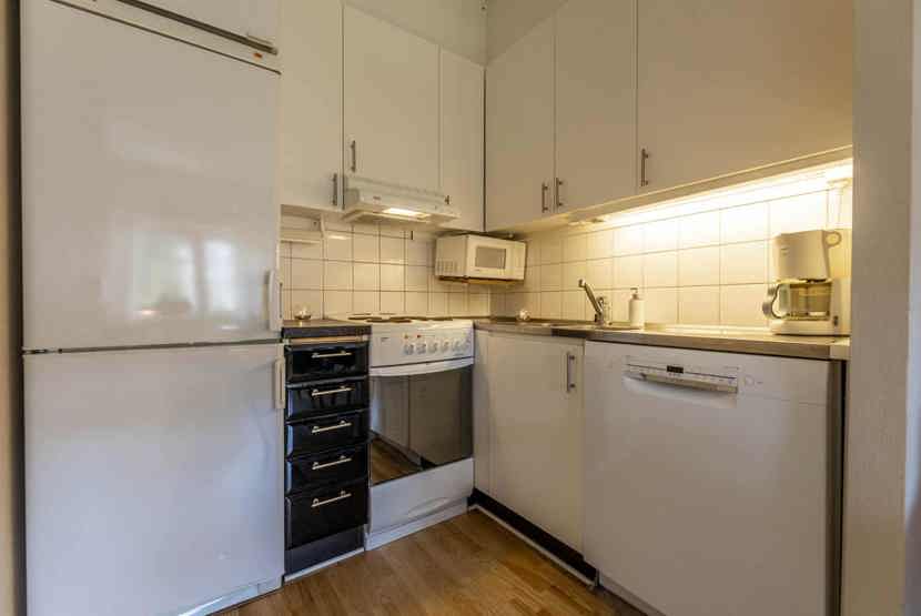 Køkkenet indeholder: elkomfur med ovn, køleskab, frys, microovn, opvaskemaskine.