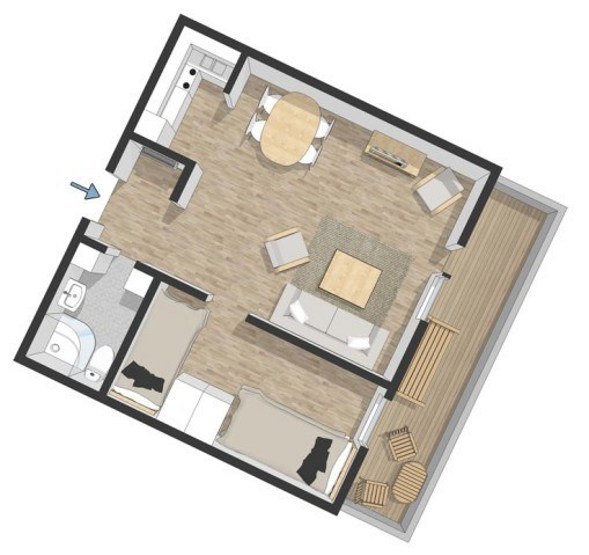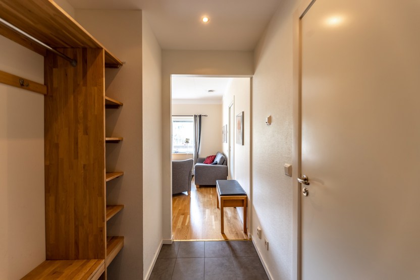 Opholdsstue med køkkenafdeling. TV, tørreskab, rum til skiudstyr, balkon, Adgang til sauna og vaskerum, elevator findes i huset.