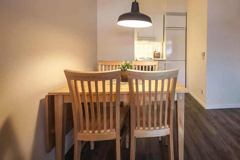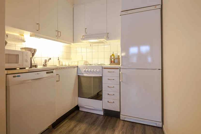 Køkkenet indeholder: elkomfur med ovn, køleskab, frys, opvaskemaskine, microovn.